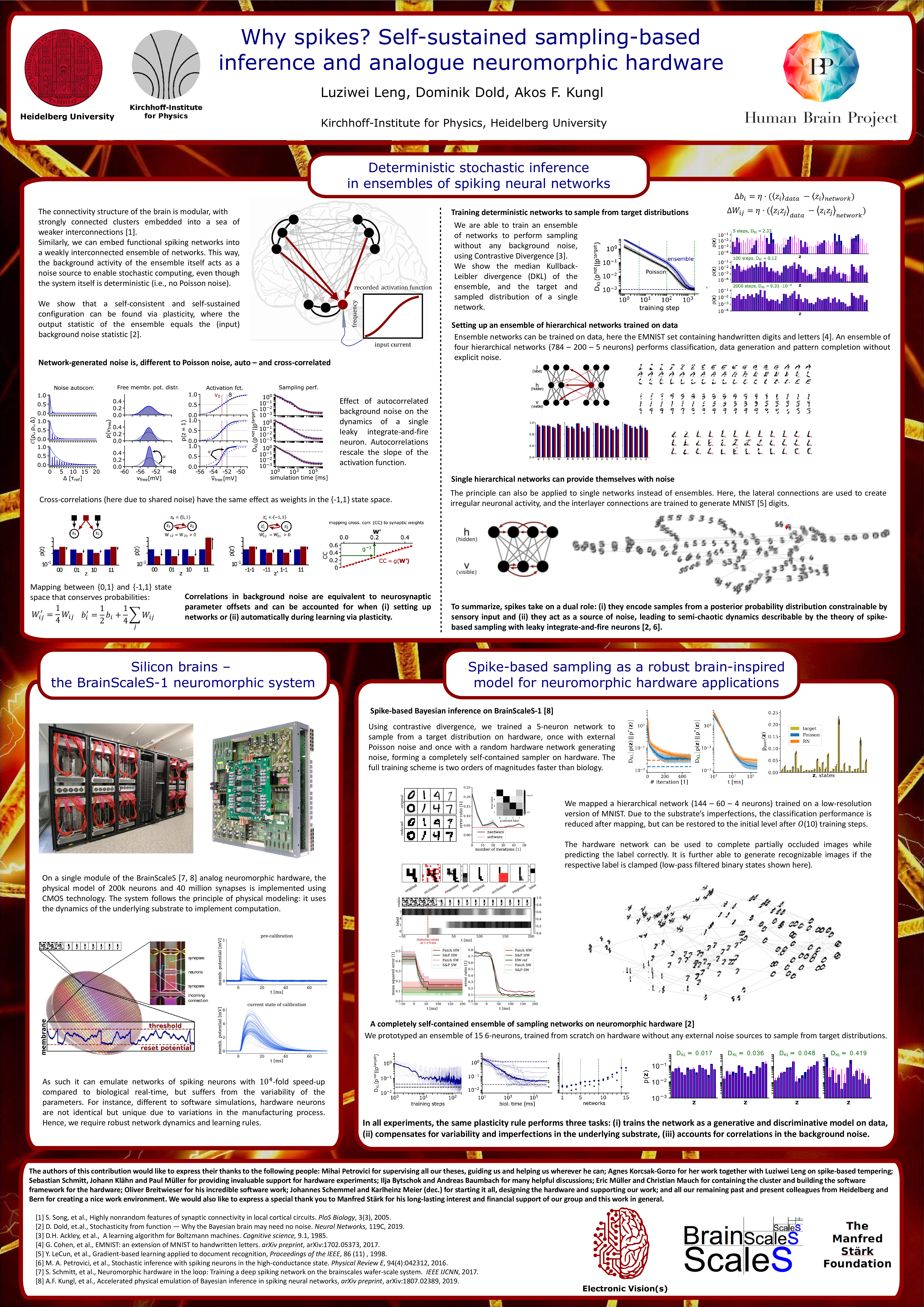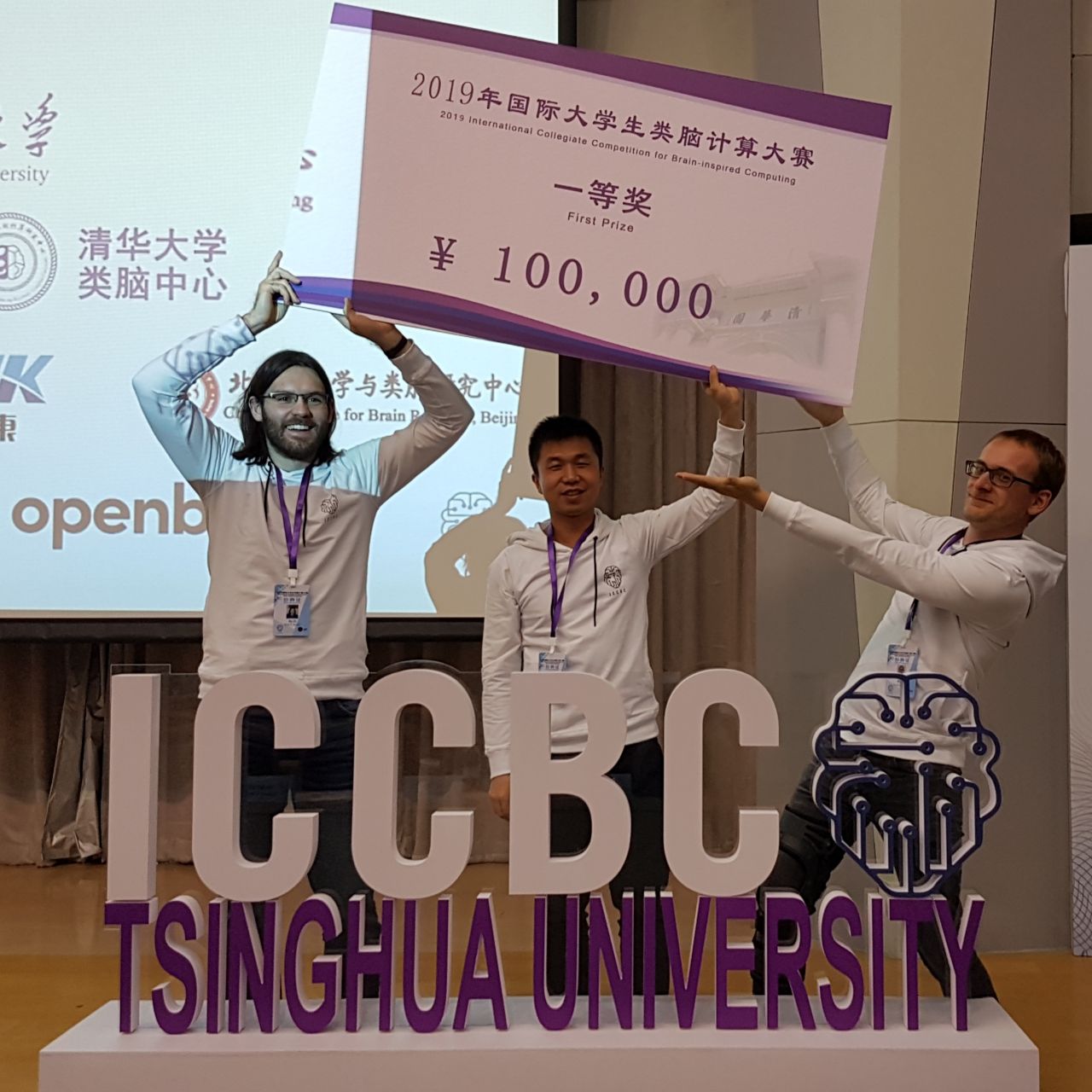 Our team consisting of (rightmost image, from left to right) Akos F. Kungl, Luziwei Leng and Dominik Dold received the first prize at the 2019 International Collegiate Competition for Brain-inspired Computing (ICCBC 2019). Our project submission titled "Why spikes? Exploring spike-based Bayesian inference for accelerated neuronal substrates" raised the question of computational benefits in spike-based computing, which we answered by presenting a summary of studies highlighting theoretical, practical and neuromorphic applications of spike-based inference.