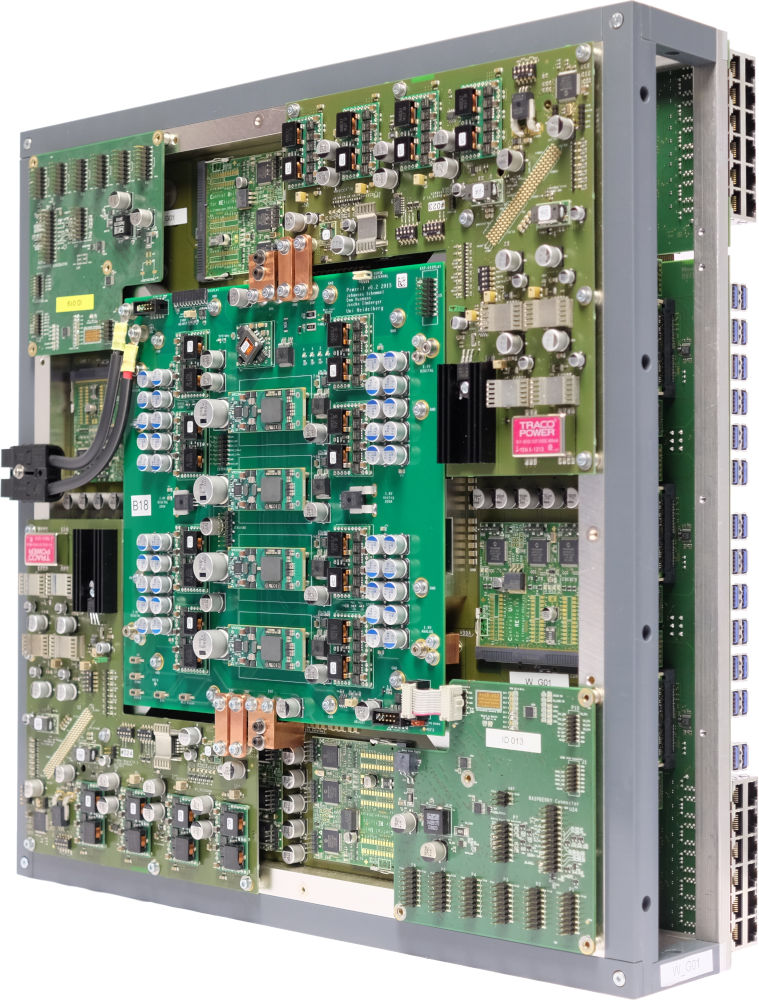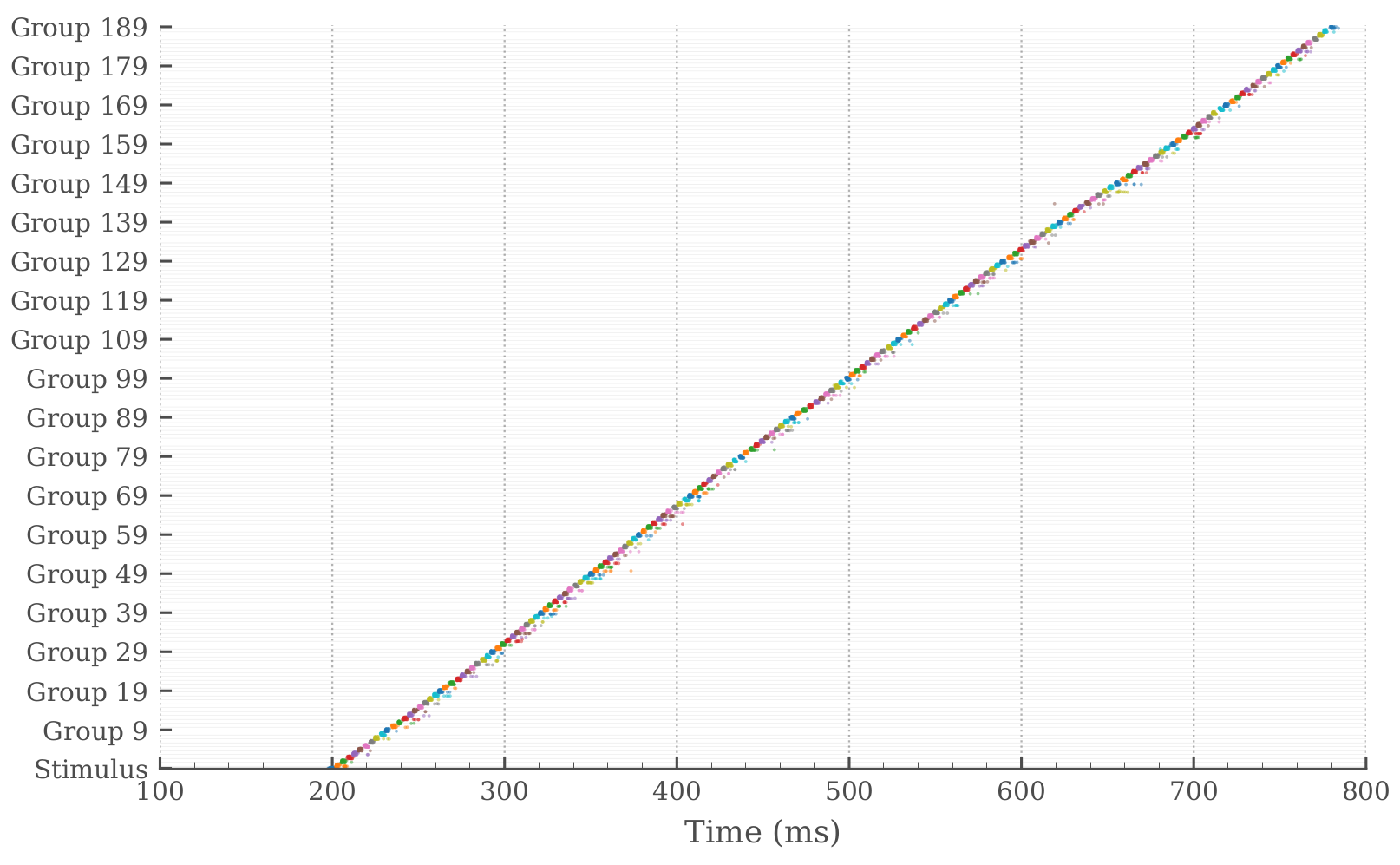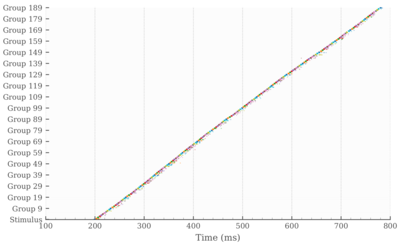 As part of his thesis Implementation of Large Scale Neural Networks on the Neuromorphic BrainScaleS-1 System Jakob Kaiser successfully implemented the largest neural network to date with 230 — of 383 available — HICANN chips operating simultaneously making full use of wafer-scale integration. The feed-forward chain studied, see raster plot, includes feed forward inhibition and consists of 190 chain links of 100 logical neurons each. 76000 neuron circuits and 1.4 million synapses were involved in the experiment. The neural dynamics evolve with a speed-up factor of 10000 compared to the biological time-scales the systems emulates.