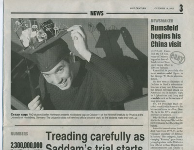 On October 19th 2005, the picture below was printed on the third page of a chinese daily newspaper called "21st Century". Nobody knows how they got it and why they printed it. A friendly student working in China found it and sent an exemplar of the newspaper to Steffen. It can be marvelled at in our lab :)