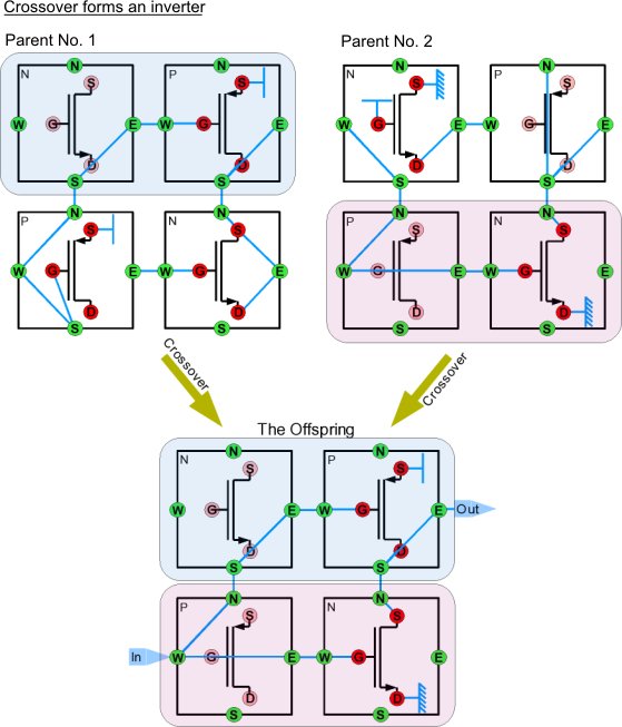 The crossover operator selects two individuals that become the parents of a new one. This is done by randomly choosing a variable block of cells of one parent and exchanging it with the corresponding block of the second. Again an inverter circuit serves to visualize how things work.