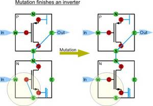The mutation operator randomly enables or disables connections between nodes and terminals of a selected individual. As an example, two partly configured transistor cells are shown that turn into a running inverter circuit by mutating one connection.