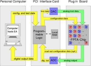 An FPGA-based PCI card connects PC and FPTA. Since this card possesses some 'local intelligence' - i.e., a Field Programmable Gate Array (FPGA) - and local memory, it can be used as a real time extension to the computer's operating system. At the begining of an evolution run, the test patterns are stored in the local RAM. During evolution the whole test sequence for one candidate solution can be controlled by the FPGA. The test patterns are converted to analog voltages by a digital to analog converter (DAC) and the analog outputs of the FPTA chip are converted back to digital signals by means of an analog to digital converter (ADC).