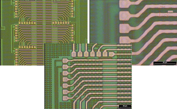 To test the feasibility of the choosen post processing method a custum made wafer has been produced. The so called test wafer does not contain any active structures. But it provides the necessary pads for the post processing. The following picture shows the test wafer without post processing.
