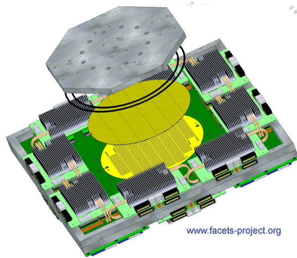 To test the interplay of these components a prototype system has been developed. The post processing is not only used for the interconnection between the reticles, but also for contact areas for the connection of the wafer to its peripheral electronics. The peripheral electronics are situated on a 9U board. The post processed contact areas are used as contact pads for flexible elastomeric connectors with a small pitch instead of using high numbers of bonding wires all over the wafer with the problems of handling and reliability. Each reticle will be provided by post processing with two rows of contacts in the described prototype system. On each row an elastomeric connector will beplaced to establish the connection to the board.