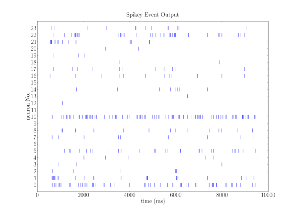 A so-called rasterplot of spike times as measured at 24 different neuron circuits in the FACETS hardware. The time scale is already converted to simulated biological real time, i.e. the real experiment duration was 200 usec (with a speedup factor of 50.000).