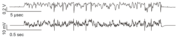 Top: The course of a membrane potential under synaptic stimulation over time, recorded at a neuron circuit in the FACETS hardware. Bottom: The membrane potential as calculated by a numerical software simulation for a corresponding model neuron under the same input as the hardware neuron above. Note the different time scales!