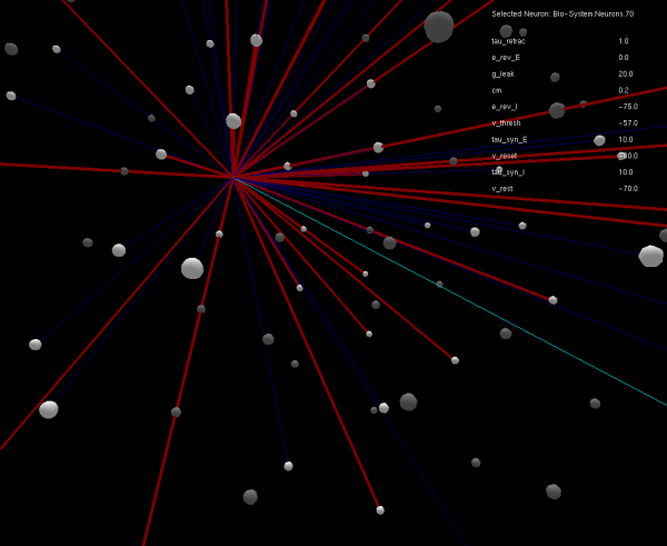 An abstract 3-D visualization (programmed by an internship student in the Electronic Vision(s) group) of a neural network, showing multiple neurons as spheres and the outgoing connections of only one of these neurons as colored lines. Blue denotes an inhibitory synaptic connection, red an excitatory one.