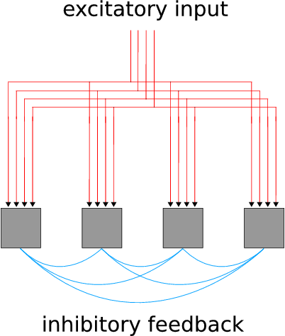 An important property of winner-take-all architectures is their lateral inhibition or cross inhibition between neurons. This mutual inhibition induces competition in the network and provides for limited output rates. During the learning competition, the synapses of the 'winner' neuron(s) to the corresponding input(s) are strengthened, whereas the output of other neurons is suppressed through lateral inhibition.
