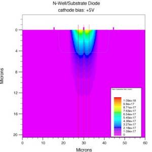 Simulated generation rate of photoelectrons in an n-well/substrate CMOS diode illuminated by a 10 um wide light spot with an intensity of 1 W/m2 at a wavelength of 675 nm. The picture was produced using the 'SILVACO virtual wafer fab' package and is taken from the diploma thesis of Peter Schneider.