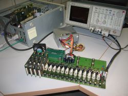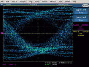 Fast edge rates and the high integration density on the NATHAN modules require controlled impedance structures all over the system to avoid transmission line effects like reflection and crosstalk. All critical nets have been simulated and their signal integrity could be verified prior to production. First measurements with the MGTs have shown that we are able to achive the full bandwidth of 3.125Gbps over a length of 50cm FR-4 and two connectors. The picture on the left shows an eye diagram of a transmission over this longest possible distance on the backplane.