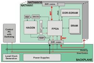 Core of the NATHAN module is the Xilinx Virtex-II Pro FPGA. It features a sufficient amount of configurable logic to run the low level parts of the training algorithms and native LVDS IOs with a maximum data rate of 800Mbps to utilize the full digital bandwidth of the HAGEN chip. Besides the HAGEN interface, two SMT connectors have been provided to accept daughter cards with future neural network chips. All neccessary support circuitry like current and voltage references is located in a shielded analog area of NATHAN.