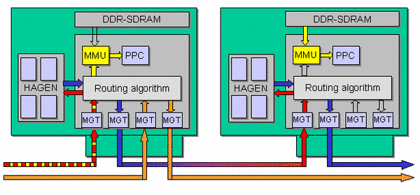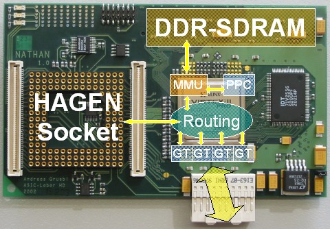 The network is also used to implement a shared memory protocol between the modules leading to a large virtual memory structure which can be accessed from every PowerPC and any Coprocessors inside the FPGA of a NATHAN module. Using the flexibility of Linux, other protocols like TCP could be implemented above the underlying network. This results in a convenient way to connect the parts of the software running on the different boards.