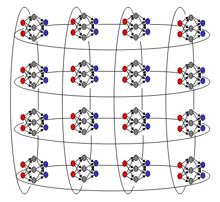 One fully equipped backplane of the distributed HAGEN setup consists of up to 16 NATHAN modules. To build up larger networks, each module is directly connected to 4 other modules on the same backplane with the 4 high speed 3.125 Gbit/s duplex serial links of the Xilinx FPGAs. The remaining modules of the backplane can be reached by routing the data via a maximum of 4 hops. To increase the amount of NATHAN boards used in the distributed HAGEN setup, several backplanes can be connected together by using FPGAs with 8 transceivers on one or more NATHAN modules. The resulting multi gigabit network transports the neural network data between the HAGEN chips of different NATHAN modules, which will result in a very large high speed artificial neural network. The routing and data forwarding is done by logic inside the FPGA and thus freely programmable which allows to experiment with different logical network topologies.