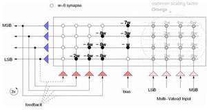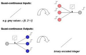 The solution to the problem of interfacing multi-valued signals to a network with binary inputs and outputs is the following: For multi-valued inputs one considers n binary input neurons to form a group encoding an n-bit integer. The integer value then needs to be translated into an analog network activity according to the significance of the representing bits. The least significant bit (LSB) induces ω, the next bits 2ω, 22ω and so on. The most significant bit (MSB) induces 2n-1ω into the network. This is a digital-to-analog conversion. The actual weight of the multi-valued input now is a common scaling factor, Ω. Similar to the combination of binary input neurons for multi-valued inputs it is possible to group elementary output neurons to act as an m-bit integer output. The task to be performed by this group of neurons is to measure the analog network activity present at their inputs and represent this activity as an integer. They act as analog-to-digital converters (ADCs). This can be realized by configuring a recurrent network topology with self-inhibiting feedback connections acting as a successive approximation ADC. The proposed solution imposes two conditions: First, the participating output neurons need to be excited by the same analog activity and, second, the analog activity has to stay stable over the course of the successive approximation. One important prerequisite of the above approaches is the homogeneity of the network's elementary elements (synapses and neurons), since several of them get combined and precalculated weights are used. This contrasts the almost inevitable property of analog circuits: their inhomogeneity in space (fabrication effects) and time (fluctuations, noise). With the chosen network model though it is possible to account for the static deviations with a simple offset correction for each neuron. The necessary calibration data is measured separately and the offsets are compensated for transparently. More details on this calibration process can be found in the publication 'A Mixed-Mode Analog Neural Network using Current-Steering Synapses' (HD-KIP-03-05).