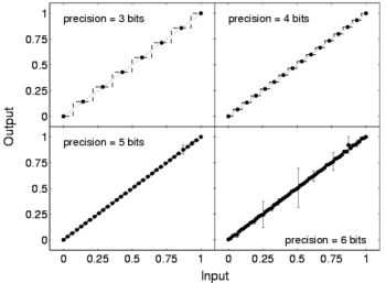 The figure on the left shows the network output of several analog to digital conversions for 3, 4, 5 and 6-bits. The above setup was used, i.e., the network activity was induced by the according multi-valued inputs. The error bars resemble the standard deviation of the repetitive measurements. The performance of the ADCs is almost perfect up to 5 bits. In the 6-bit case there are deviations of a few LSB for input codes where the MSB or the second most important bit turns on and the lower bits go off.