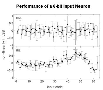 It was successfully shown that it is possible to obtain multi-valued inputs of up to 6-bit precision with a calibrated HAGEN chip. The figure on the right shows plots of the commonly used performance measures differential non-linearity (DNL) and integral non-linearity (INL) versus the applied input code for a group of 6 neurons acting as a multi-valued input. Since the DNL is always smaller than 1 LSB, the monotonicity of the DAC is guaranteed. In practice, not only a single multi-valued input is needed but rather several of them. Measurements show that a sufficient precision for 6-bit inputs across a network block is reached.